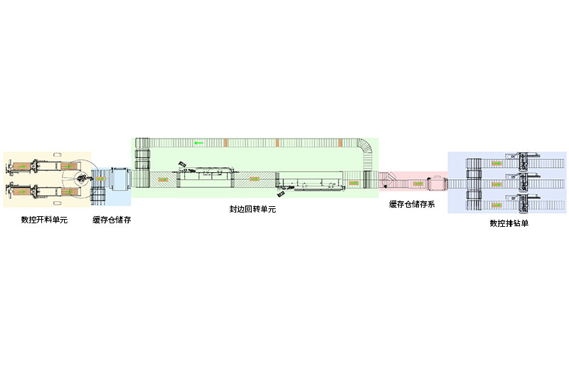 板料由動力滾筒輸送至封邊機(jī)→由第一臺封邊機(jī)完成第一條邊封邊→第二臺封邊機(jī)完成第三條邊封邊→板材回轉(zhuǎn)再次完成第2、4條邊封邊→完成封邊的板材進(jìn)入緩存?zhèn)},一次排隊(duì)輸入打孔鉆單元