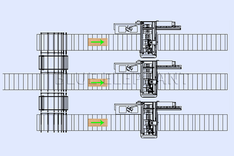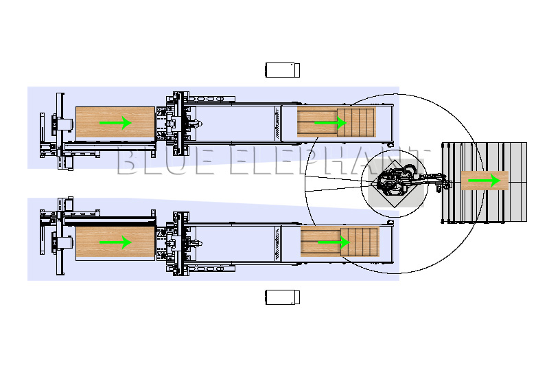叉車送料至升降機(jī)→貼標(biāo)機(jī)抓取板料自動貼標(biāo)→開料機(jī)鉆孔、開槽、開料→機(jī)器人抓料送至平移動力輸送輥臺→進(jìn)入緩存?zhèn)},一次排隊(duì)等待運(yùn)送至封邊單元